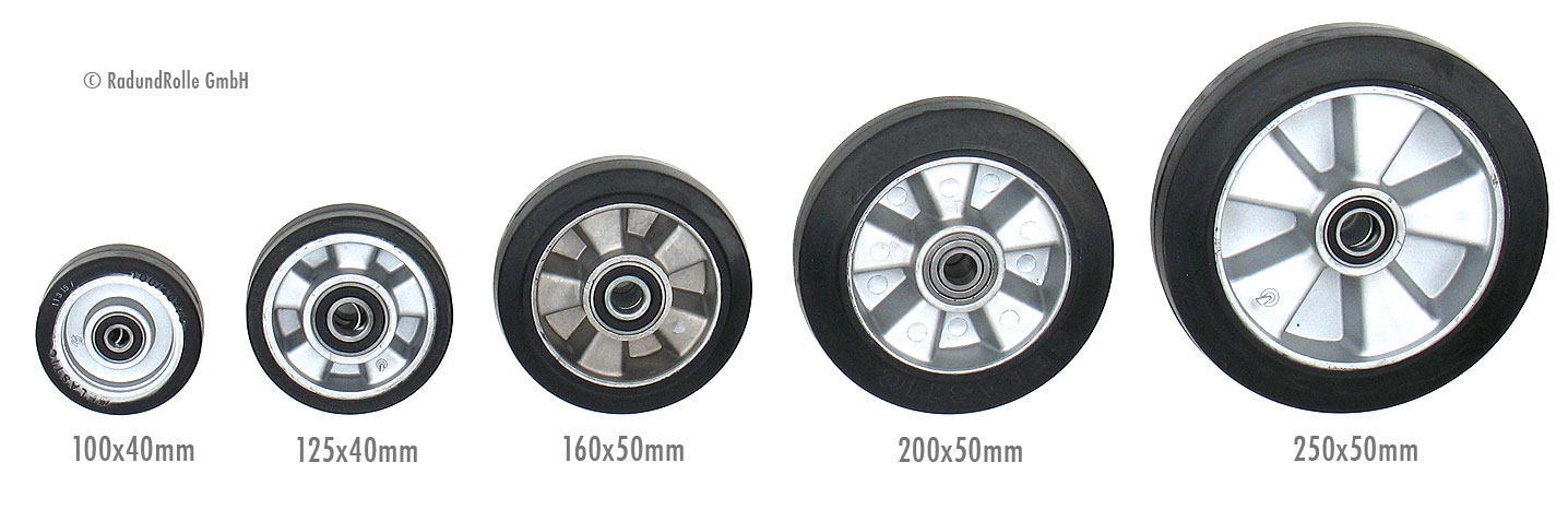 | Räder mit Elastik-Gummireifen schwarz auf Alufelge Reifen aus Elastik-Gummi schwarz (Härte 70º Shore A), temperaturbeständig von -20°C bis +60°C, korrosionsunempfindliche Felge aus Aluminium mit Kugellager-Nabe. Durch das relativ weiche Gummi und die kugelgelagerten Aluminiumfelgen bieten Elastik-Räder einen deutlich besseren Fahrkomfort als herkömmliche Vollgummiräder. Parallel dazu ist die Tragkraft bei diesen Rädern erheblich höher als bei Standard-Vollgummirädern. Die Räder laufen geräuscharm und sind bodenschonend aber nicht ganz spurlos. Elastikgummi ist recht abriebfest und hat einen geringen Rollwiderstand. Geringfügige Abweichungen in der Bauart möglich